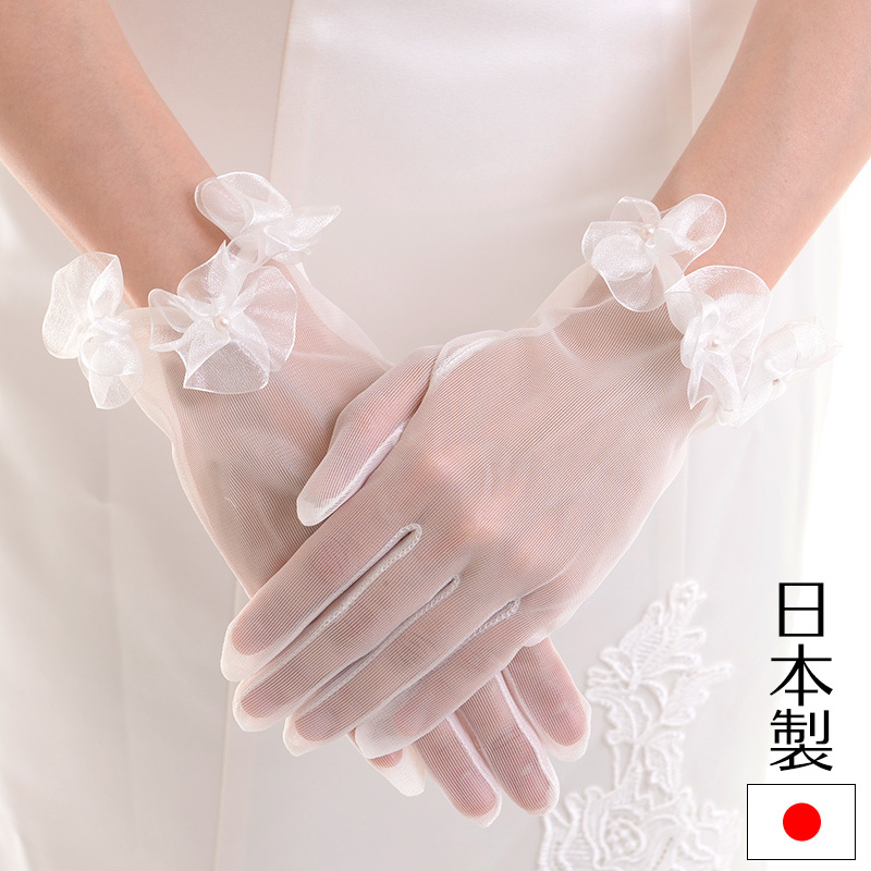 ウェディンググローブ 3花パール留め 日本製 手袋 ブライダル 花嫁 結婚式 挙式 オフホワイト 生成