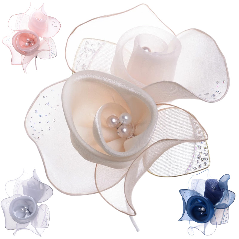 パールの花弁をシフォンとオーガンジーの質感の異なる花びらで巻き包んだ繊細なコサージュです。大き過ぎずフォーマルなスーツとのバランスも○ ラメは控えめながらオーロラが入っているので、ハレの場にふさわしい華やかさも兼ね備えています。