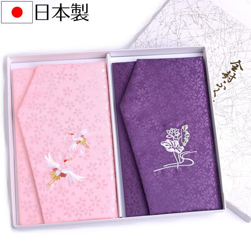 鶴(お祝い)・蓮(お悔やみ)の刺繍を施した慶弔ふくさ2枚セットです。