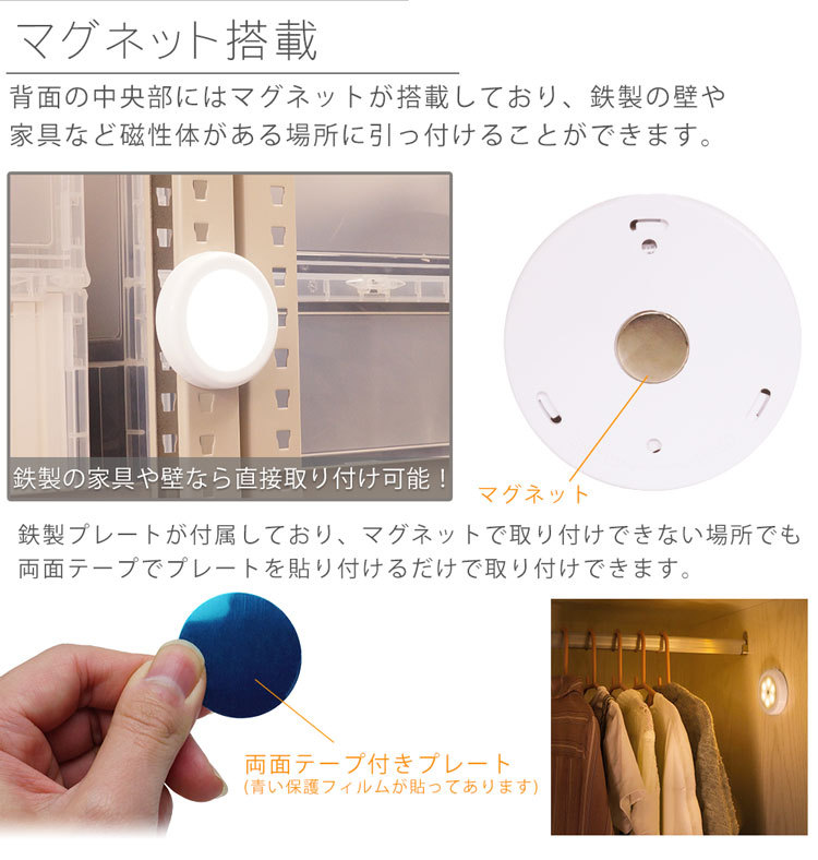 両面テープとマグネットでクローゼットや廊下、階段など家中の照明ライトとして活躍します。
