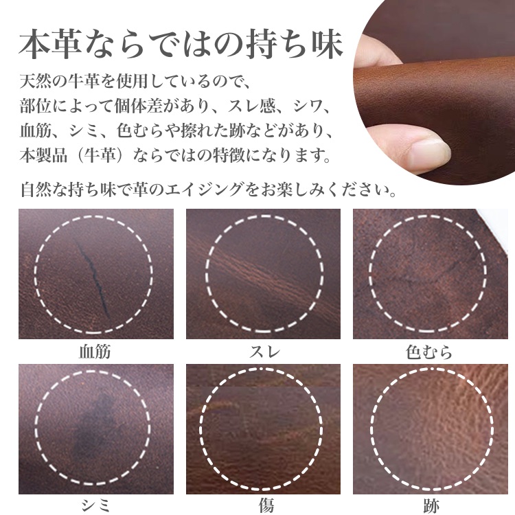 本製品(牛革)の特徴です。自然な持ち味で革のエイジングをお楽しみください。