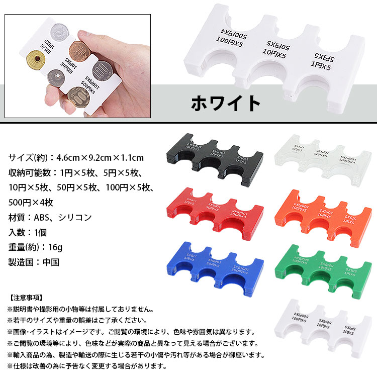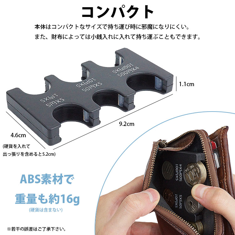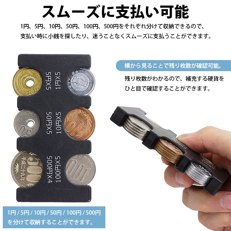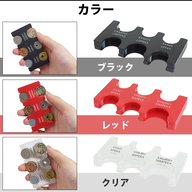 収納可能数:1円×5枚、5円×5枚、10円×5枚、50円×5枚、100円×5枚、500円×4枚