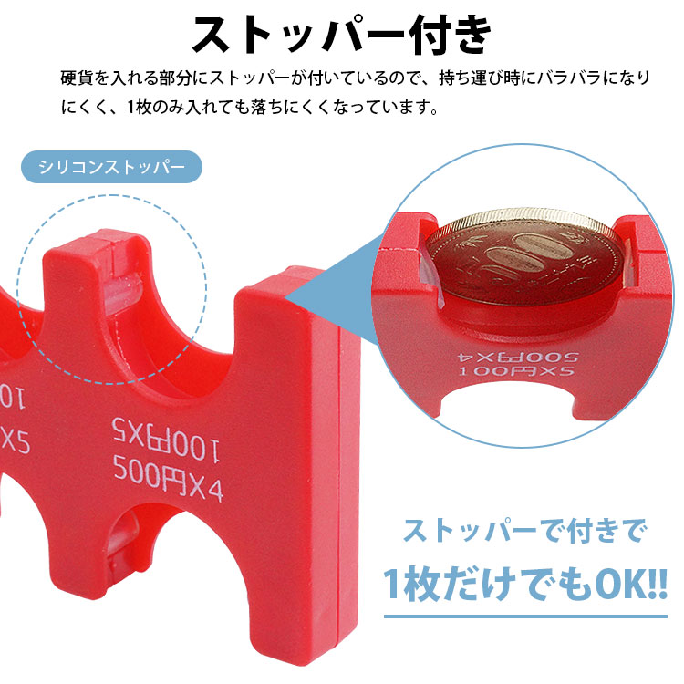 硬貨を入れる部分にストッパーが付いているので、持ち運び時にバラバラになりにくく、1枚のみ入れても落ちにくくなっています。