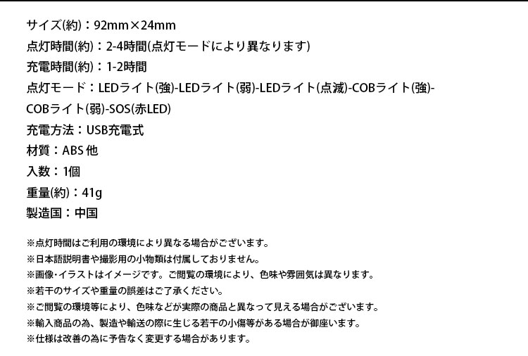点灯モード:LEDライト(強)-LEDライト(弱)-LEDライト(点滅)-COBライト(強)-COBライト(弱)-SOS(赤LED)