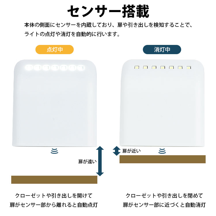 本体の側面にセンサーを内蔵しており、扉や引き出しを検知することで、ライトの点灯や消灯を自動的に行います。