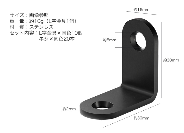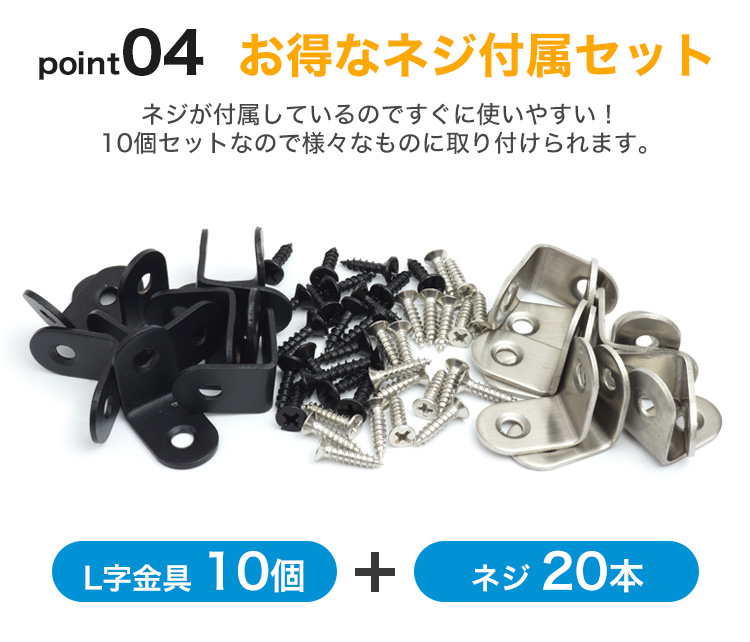 L字金具10個とネジ20本セットですぐにご使用いただけます。
