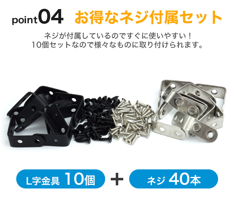 L字金具10個とネジ40本セットですぐにご使用いただけます。