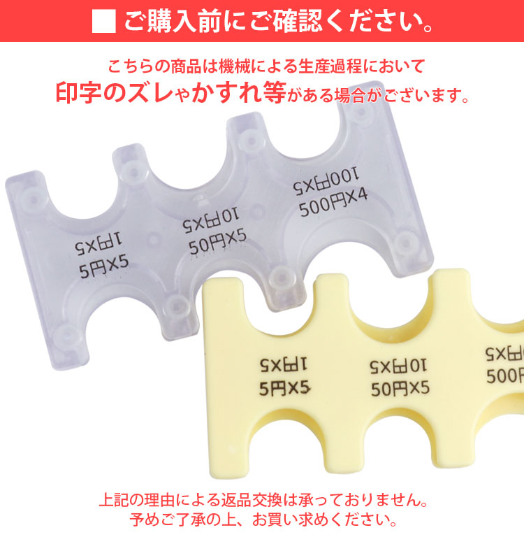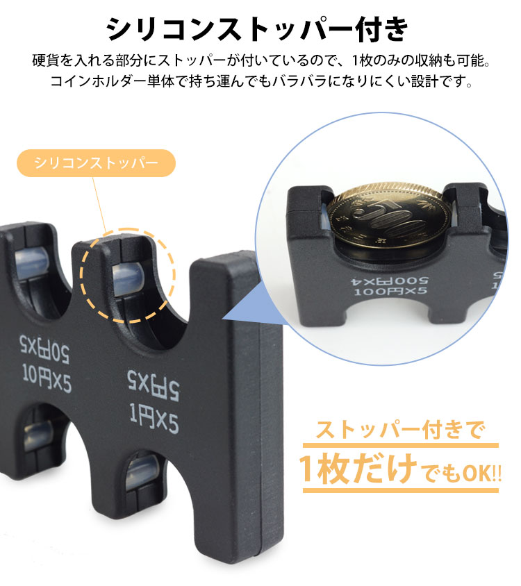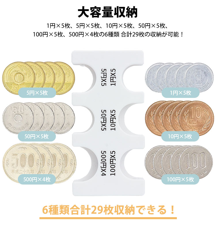 収納可能数:1円×5枚、5円×5枚、10円×5枚、50円×5枚、100円×5枚、500円×4枚