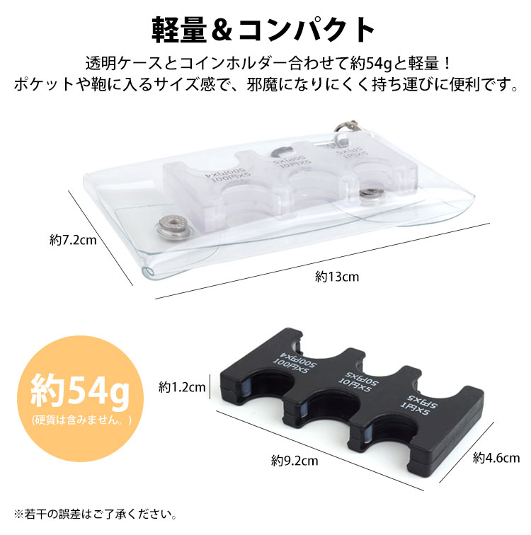 透明ケースとコインホルダー合わせて約54gと軽量!ポケットや鞄に入れて持ち運ぶことができます。