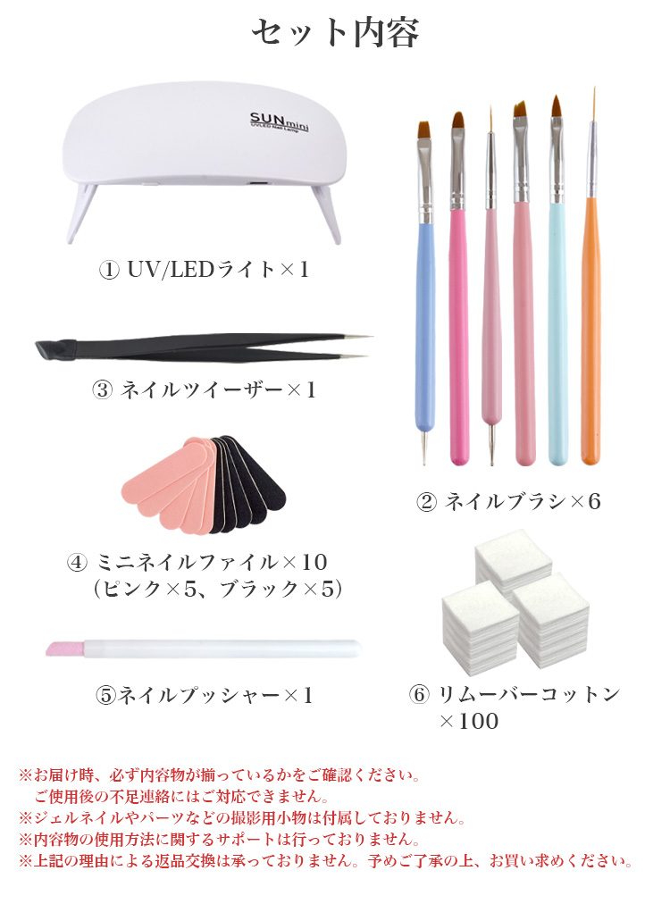 セット内容:UV/LEDライト×1、ネイルブラシ×6、ネイルツイーザー×1、ネイルファイル×10(ピンク×5、ブラック×5)、ネイルプッシャー×1、リムーバーコットン×100