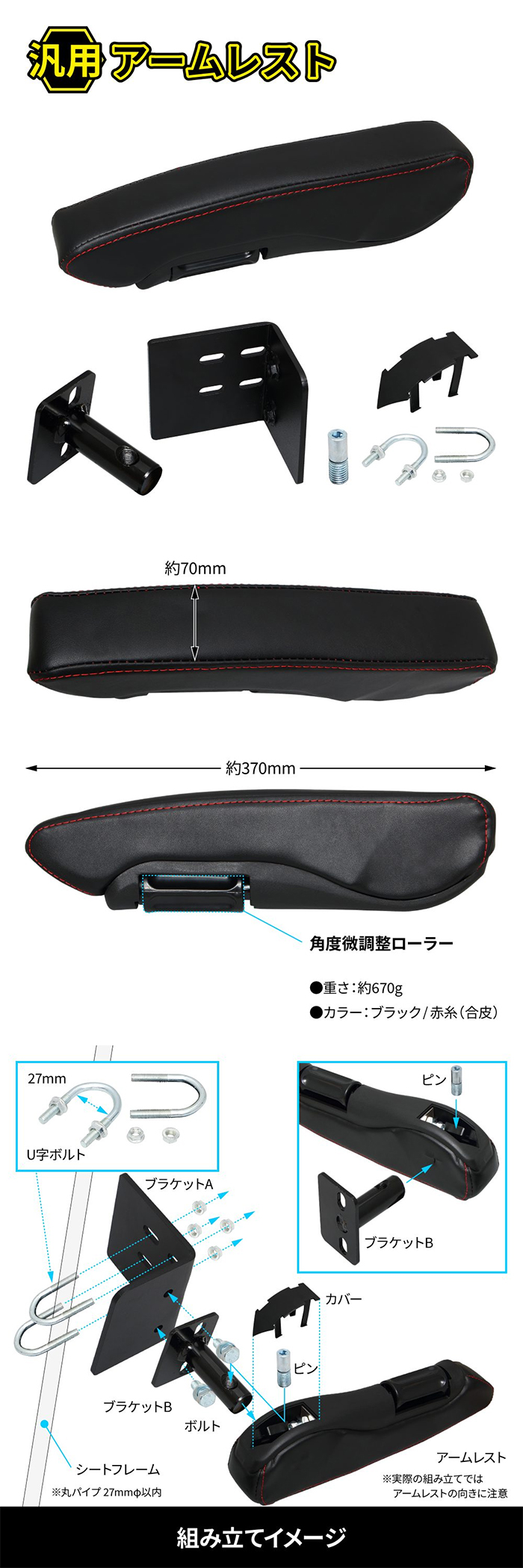 ■汎用アームレスト 運転席側用【PRODUCT FEATURES 製品の特徴】ひじ掛けの上げ下ろし、角度の微調整が可能な汎用アームレスト。ひじ掛けがないスタンダード仕様の車両に!【PRODUCT DETAIL 製品詳細】商品コード594920商品名汎用アームレストJANコード4976383484859【PRODUCT SPEC 製品仕様】内容アームレスト本体、取付けブラケットAB、U字ボルト&ナット、固定ボルト、固定ピン※取付けには加工が必要となります。(シート生地や一部スポンジ材をカット)※シートフレームが丸パイプのタイプのみ適合します。※車両により取付けができない場合があります。取扱説明書をご確認ください。