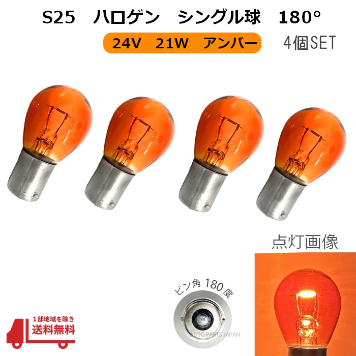 S25 ハロゲンバルブ シングル球 オレンジ 橙 アンバー 21W 24V 4個 ピン角180度 イエロー 黄