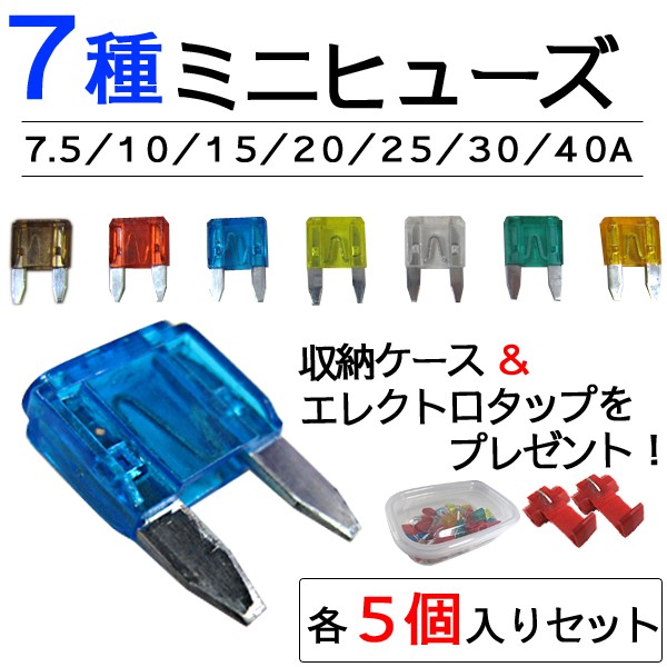 【互換品】ミニヒューズ(7種類×各5個/合計35個)収納ケース エレクトロタップ付き/7.5/10/15/20/25/30/40A