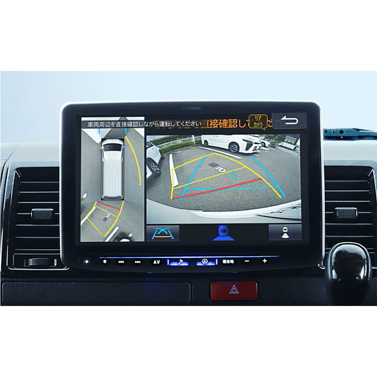■アルパインのカメラシステム「ドライブセンサー」との連携時、カメラ映像内に運転をサポートするガイド線を表示します。