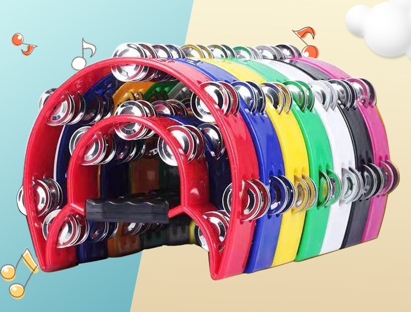高品質 手持ちタンバリン 1個 演奏楽器 パーカッション 半月型 半円型 3色(ブラック ブルー レッド )二列構造 耐久 20個金属ジングル