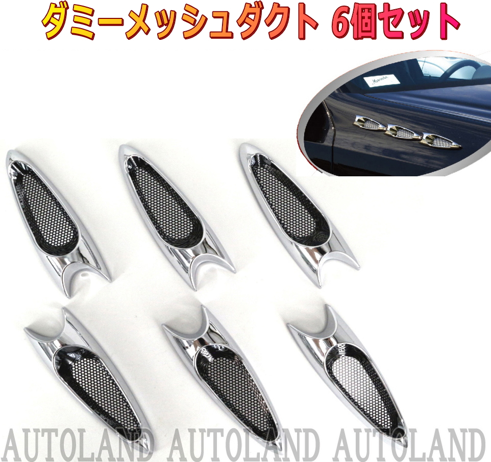 | 汎用ダミーダクトです。 6個セットなので、左右3個ずつでも、ボンネット等に6連装着でもOKです。 粘着テープ付属なので貼り付けるだけの簡単装着。 |