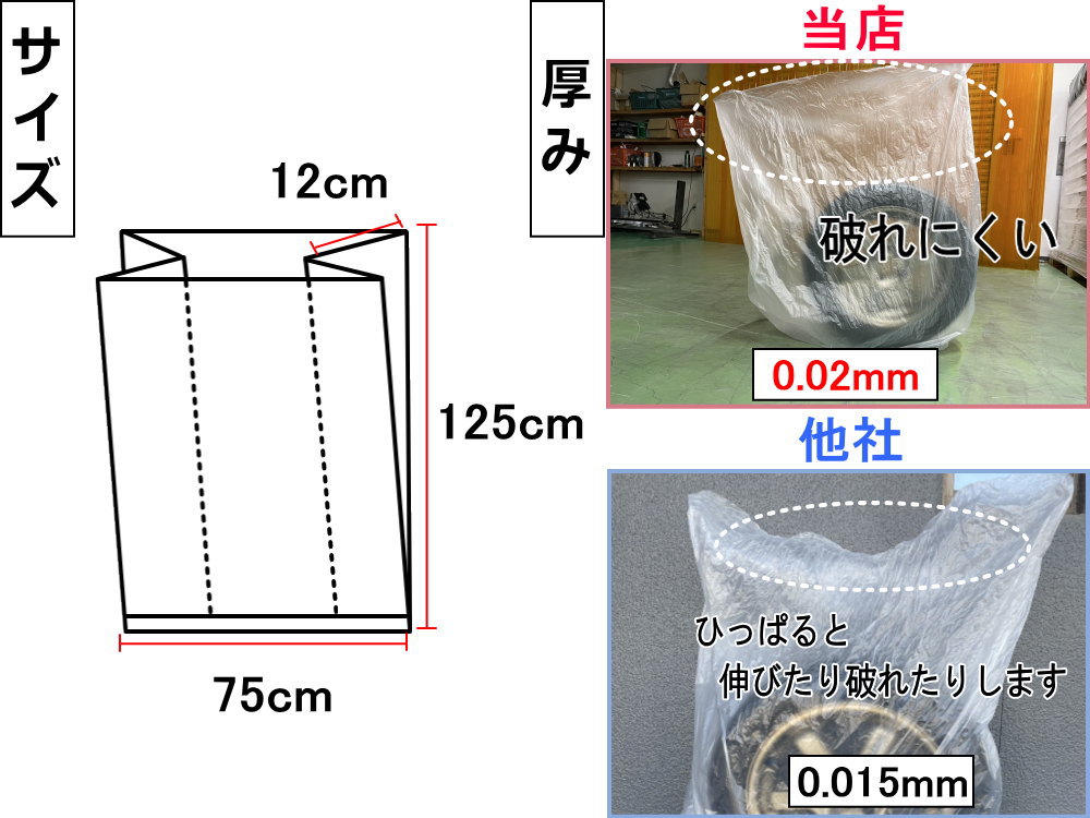 ◆比較表 | 項目 | 当商品 | 一般ビニール袋 | | 素材 | 高密度ポリエチレン | 普通のポリエチレン | | 厚み | 0.02mm | 0.015mm以下 | | マチ付き | あり | なし | | 対応サイズ | 12〜17インチ | サイズ不明 |
