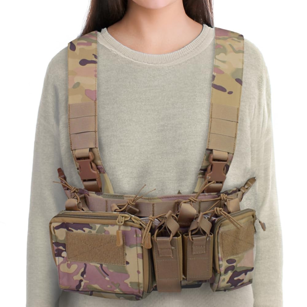 | 商品の説明 | 素材:1000D強化ナイロン製 カラー:グリーン・グレー・ブラウン・ブラウン迷彩・ブラック・ブラック迷彩 サイズ(約):肩帯最短40cm - 最長63cm バッグ横長さ32cm 強化改良を行いました!ナイロン密度を1000Dに改良し、耐久性・機能性を最大限引き上げたモデルとなっております。 機能性の他にもファッション性に優れており、バリエーション豊富でおしゃれなデザインとなっております。サバイバルゲーム時の着用におすすめです。 ベストタイプは重く感じる方や苦手な方は軽量タイプのチェストリグを選択肢に!・ユーティリティポーチ、M4系マガジンポーチが標準装備されております。 約40cm~62cmと幅広く調整ができる為、どんな体型の方でも装着できます。ショルダー部やウエストベルトはバックルで簡単脱着可能です。可動範囲の調整が広く大きいので幅広い体型の方に対応! |