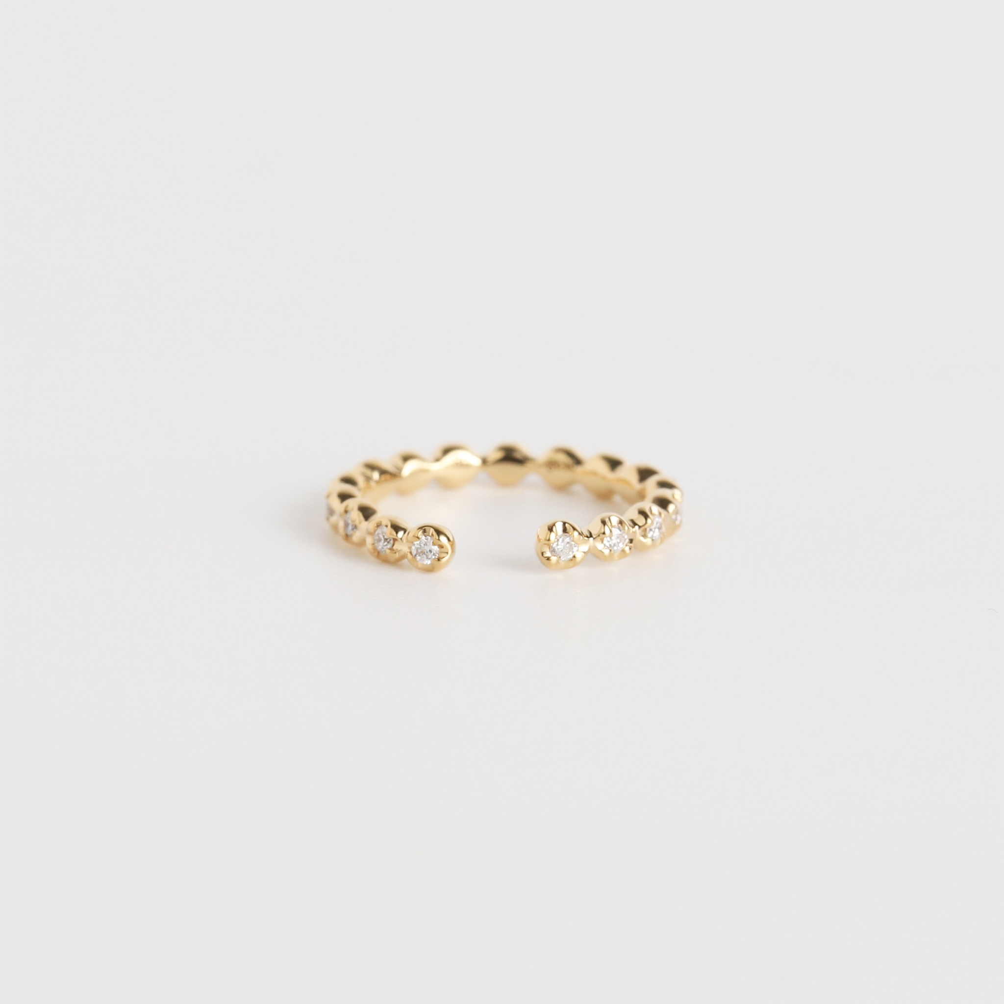 ミニマルなゴールドの粒が連なり描く繊細なラインは、指先に軽やかなリズムと華やぎをもたらします。華奢でありながらも、日常の動きにしっかりと耐えうる強度を備えたつくりは、永く寄り添うパートナーとしての信頼の証。ひとつでシンプルに、重ねづけで表情豊かに。