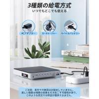CDプレーヤーまたはDVDプレーヤーとして利用可能なこのミニDVDプレーヤーは、本体重わずか280g、横幅15cm、高さ3cm、奥行き14cmという小型なサイズで、どこへでも持ち運びが容易です。