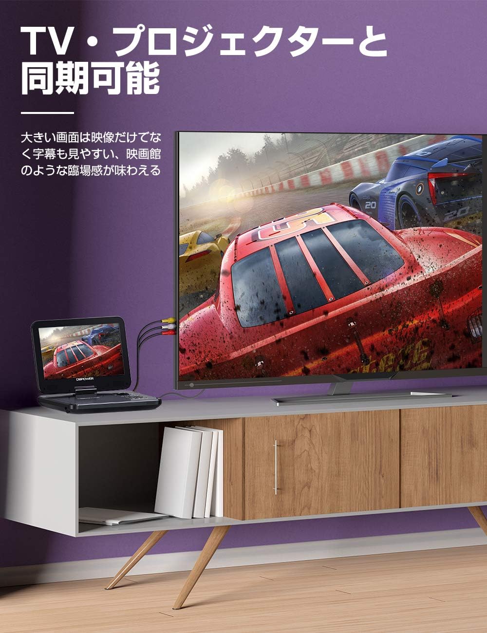 AV出力にも対応、付属したケーブルを繋げればテレビの大画面でDVD鑑賞可。