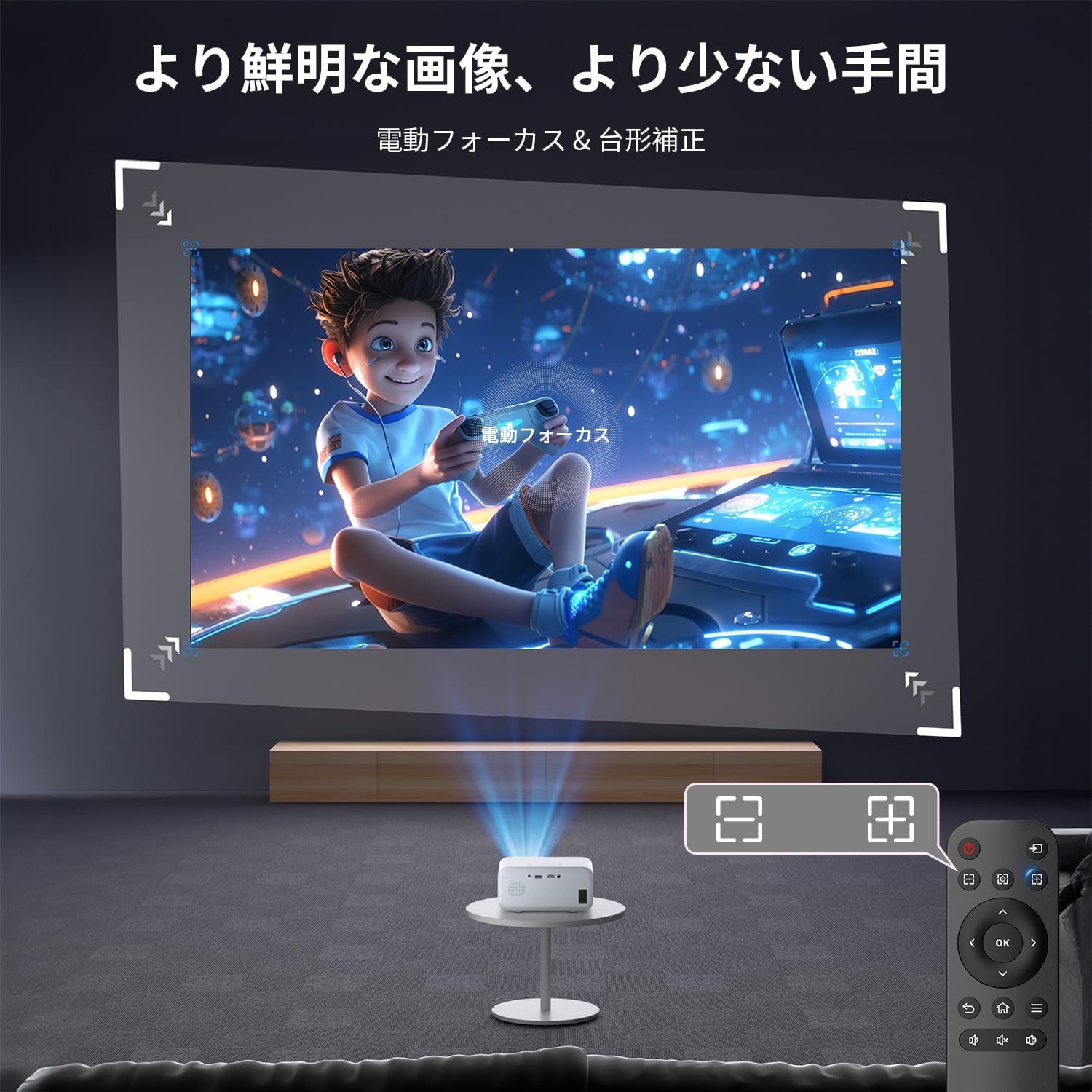 小型プロジェクタ台形補正機能が±15度の調整も簡単に行えます、お部屋の空間に応じて設置できます。