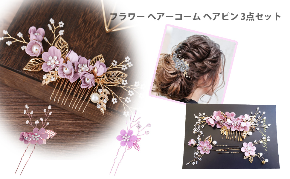 フラワー ヘアーコーム ヘアピン 3点セット 髪飾り 発表会 ヘアアクセサリー 結婚式 入学式 卒業式 和装髪飾り 洋装髪飾り