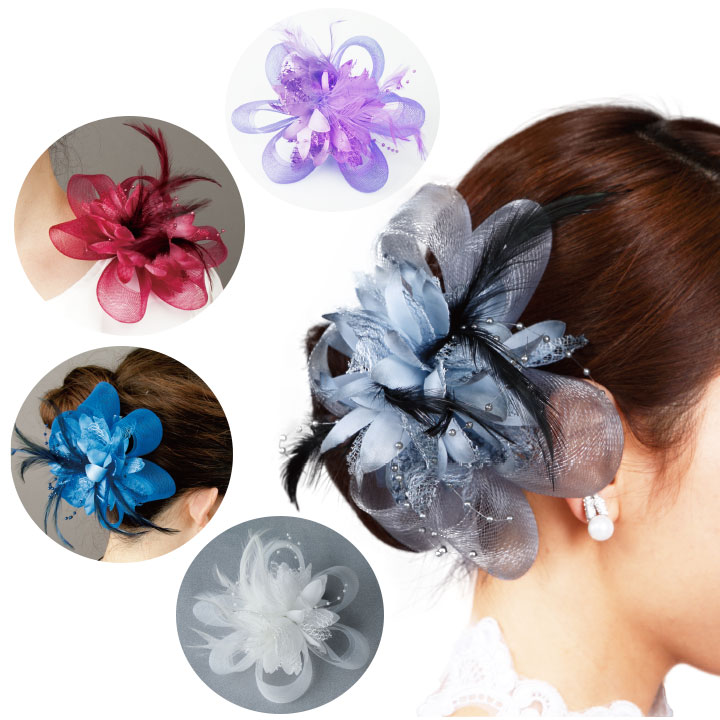 チュールネットの上に花びらやビーズ、羽根などをあしらったモチーフ。 クリップ付なので、コサージュ以外にもヘアアクセとしても使えて様々なシーンで活躍します。 | |