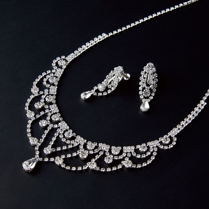1つあると便利なネックレスとイヤリングのセット。 大小のストーンがライトに当たってキラキラと光り輝きます。 | |