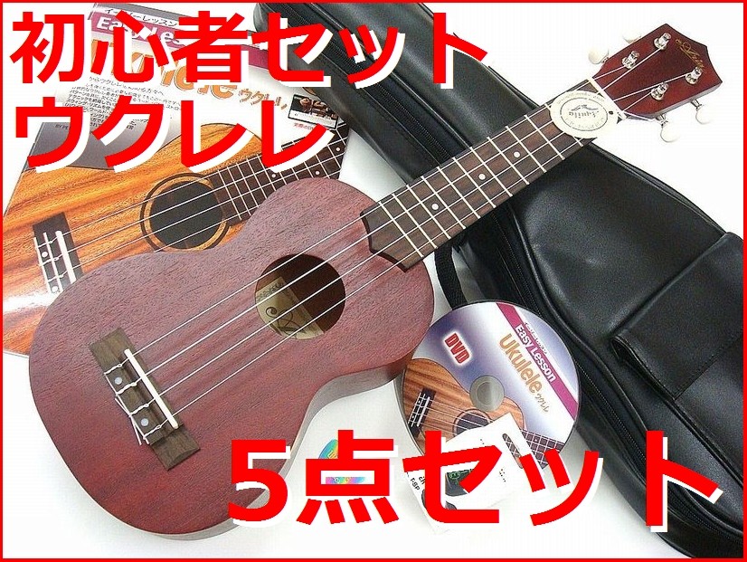 便利なクリップ式チューナー・フェイクレザーソフトケース・DVD付教則本・ピックの入門セットつき。