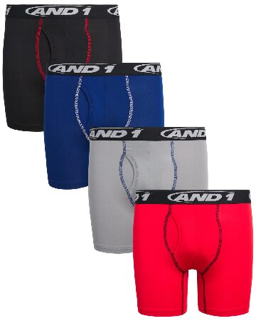 AND1 Boys' Boxer Briefs - 4 Pack Functional Fly Compression Boys Boxers - Performance Underwear for Boys (6-18), Size X-Large, Red/Grey/Black/Blue