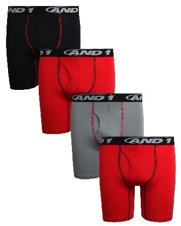 AND1 Boys' Boxer Briefs - 4 Pack Functional Fly Compression Long Leg Boxers - Performance Underwear for Boys (6-18), Size 8-10, Red/Black/Grey