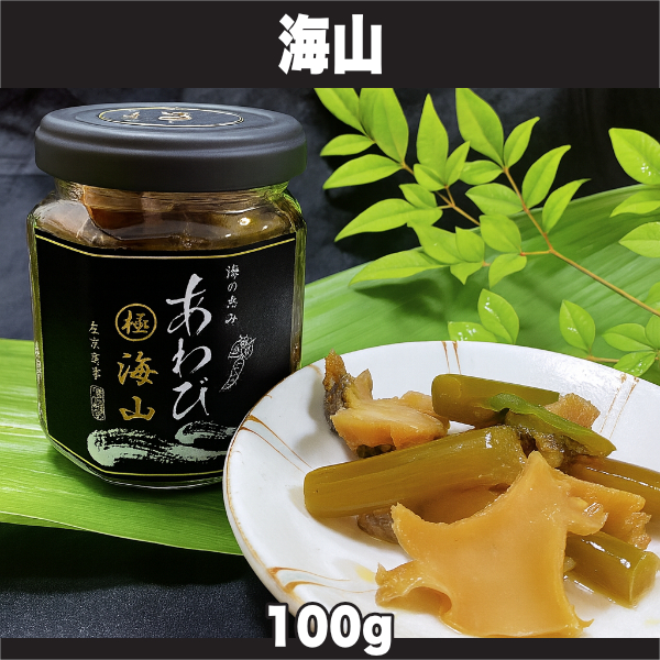 海山は、伝統的な栽培方法で生産された水わさびの茎と、当店自慢のあわびを、水にまでこだわって作り上げた秘伝の醤油出汁に漬けた、贅沢な珍味です。
