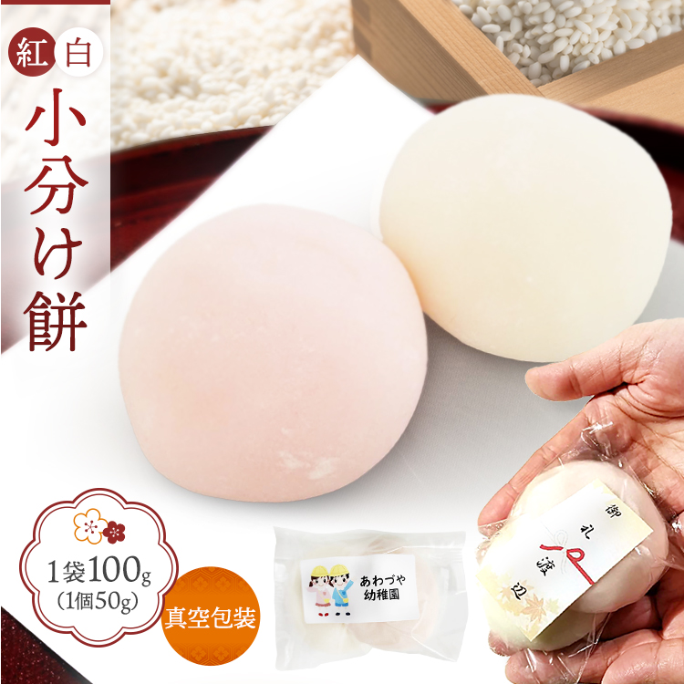 こちらの商品は『数量1のご注文で、約50gのお餅が、紅白1つずつ合計2つで、100gが入った袋を、1つ』という商品です。