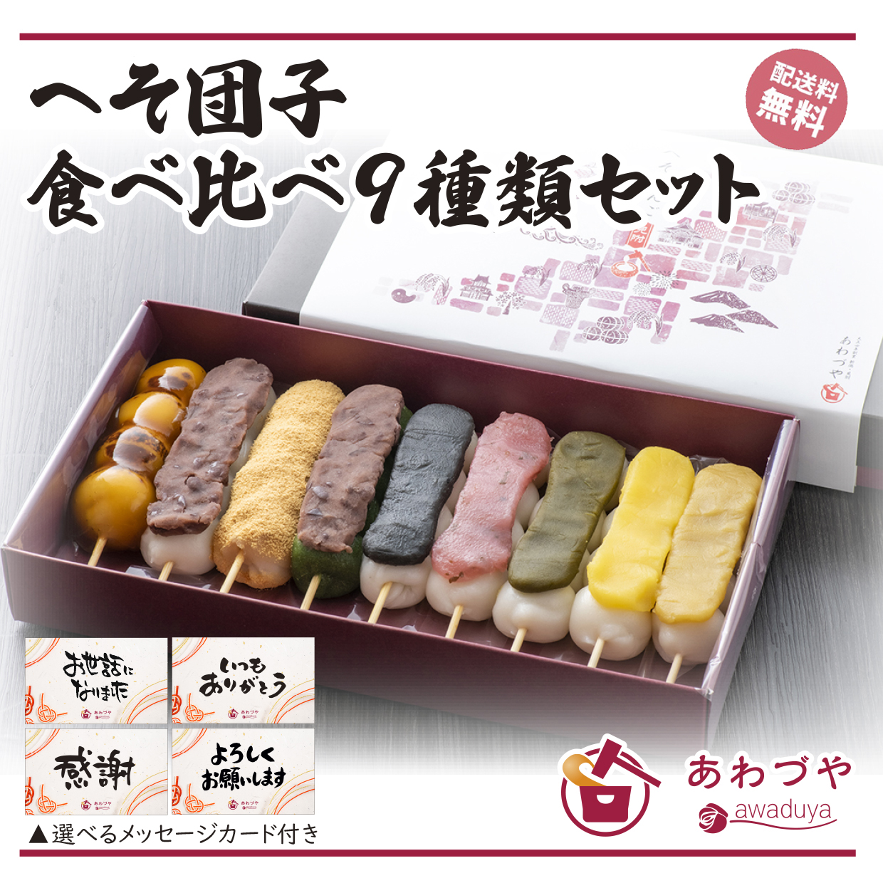 しょうゆ、つぶあん、きなこ、草、ごま、桜、抹茶、栗、焼き芋の合計9本を化粧箱に入れて、冷凍便でお送りいたします。
