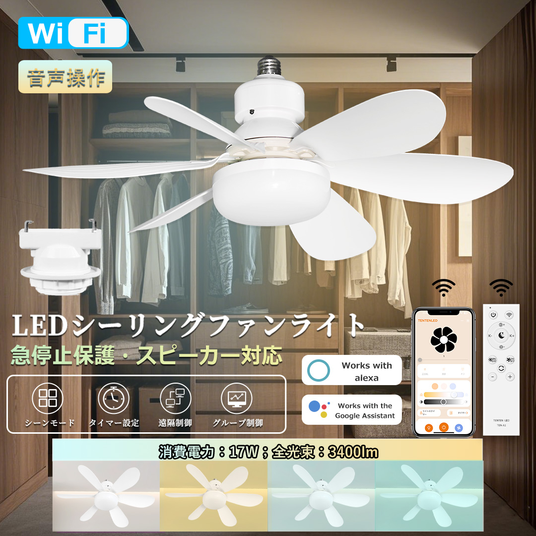 ●操作方法は多様で、音声操作(Amazon Alexa/Google Assistantなど対応)、リモコン操作、スマホ制御(Tuyaアプリ)、遠隔操作に対応しており、離れた場所からでも快適に制御できます。外出中でも「オン・オフ」「タイマー設定」「風量無段階・ledライト無段階調光調色」が可能。