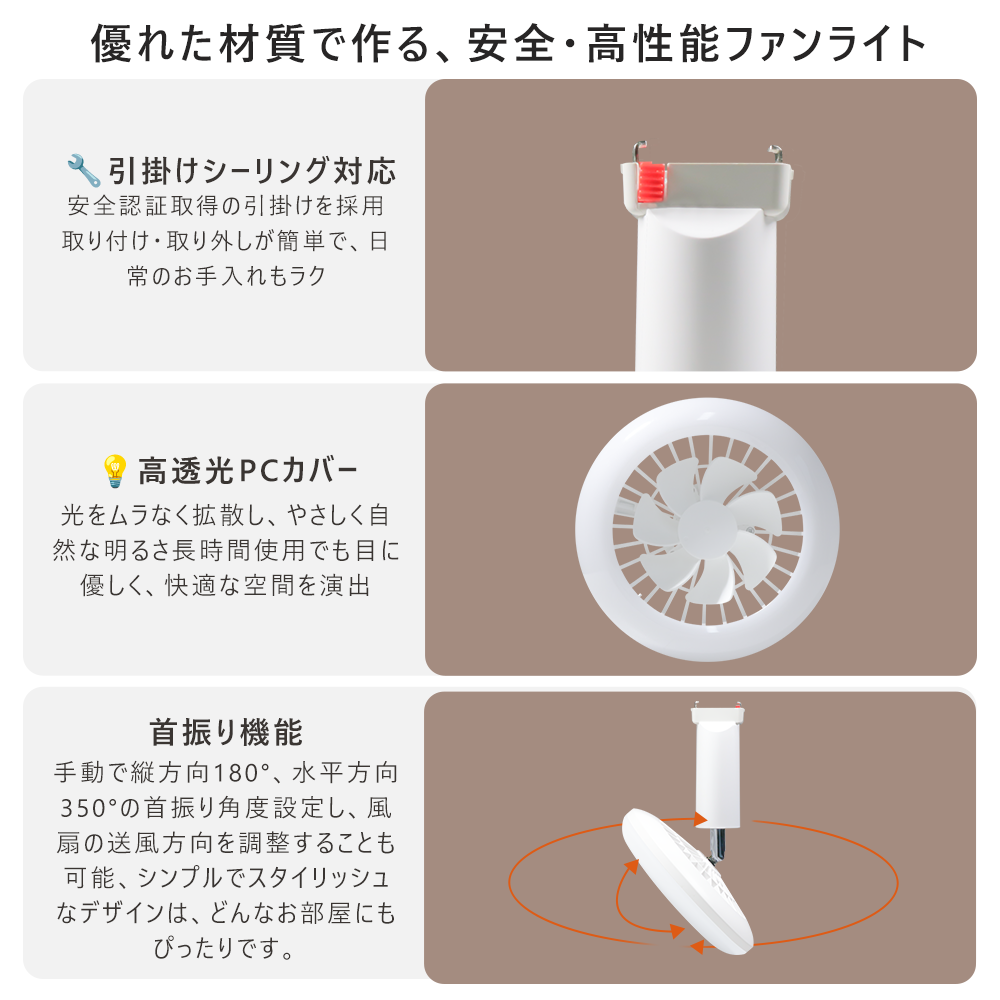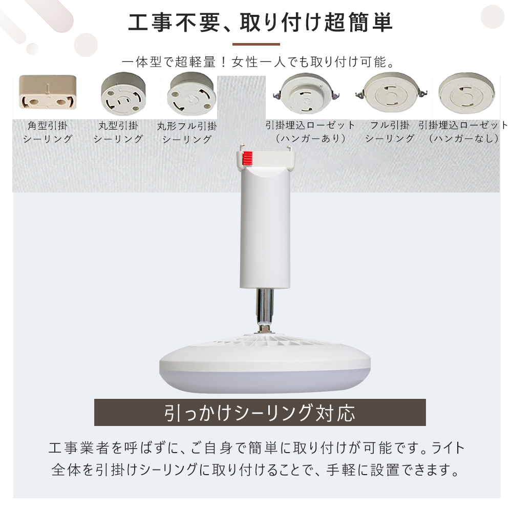 ● このシーリングファンライトは、工事不要で簡単に取り付け可能です。引掛けシーリング取り付けサポートにより、専門業者を呼ぶことなく、自分で手軽に設置できます。ライト全体を引掛けシーリングに取り付けるだけで、女性一人でも簡単に取り付け完了。手間なく快適な空間を作り出せます。