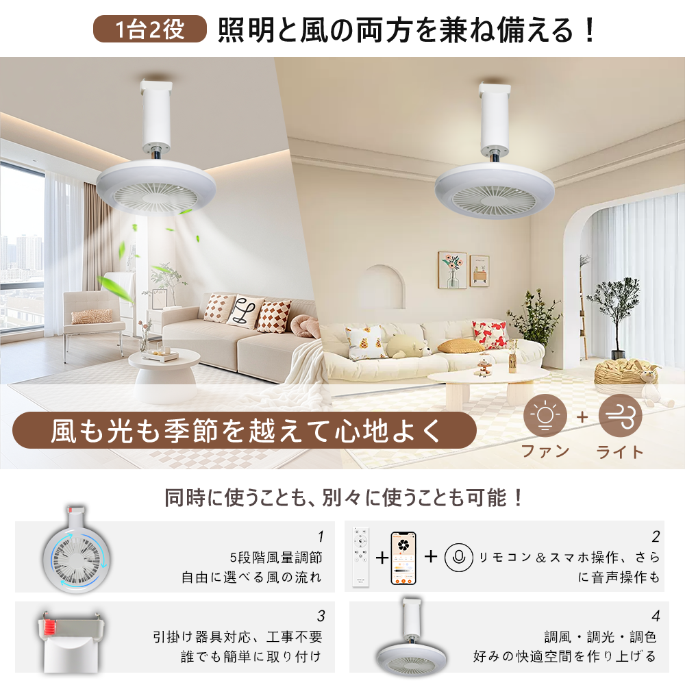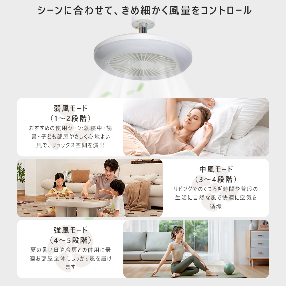 ☆風量調整:アプリで無段階/リモコンで5段階