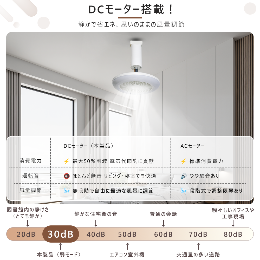● DCモーターを搭載しており、従来のACモーターに比べて、エネルギー効率が高く、長寿命を実現します。DCモーターは強力な風量を維持しながらも、消費電力が少なく、省エネ効果が抜群です。また、稼働中の音が非常に静かで、快適で静かな環境を提供します。さらに、DCモーターは風速の調整がより精密で、使用シーンに合わせて柔軟に調整可能です。