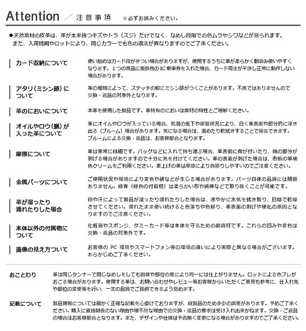 万一、革表面に水滴がついても乾いたタオルやハンカチで拭き取って頂ければ問題ありません。
