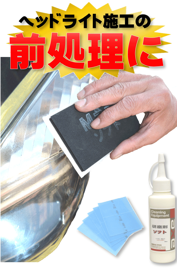 剤により、ヘッドライトの汚れ落し、その後のヘッドライト磨きやヘッドライトコーティング施工の前処理が効果的にできます。
