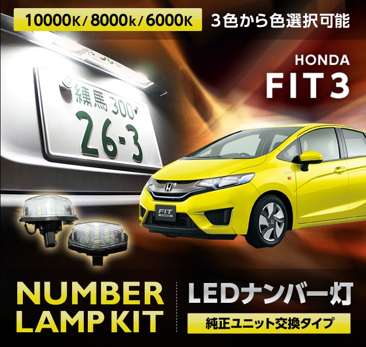 ホンダ フィット3<BR>【2013年9月〜 型式:GK3・4・5・6/GP5】3色選択から可能!<BR>高輝度3チップLED仕様ユニット交換<BR><BR>専用ナンバー灯<BR>2個1セット