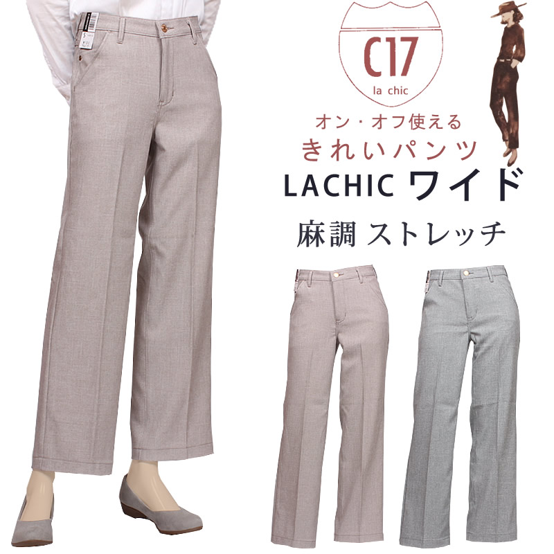 LA CHICはフランス語で粋で上品な洗練されている女性を意味します。そのイメージで作られたオン・オフ使えるきれいパンツ。見た目も涼しげな麻調ストレッチ素材。乾きやすく、軽く、シワになりにくい、使い勝手に優れた素材。 シルエットは、太過ぎず、裾に向かって広がりすぎない脚長効果抜群のワイドパンツ。 細部のディティールまで上品さと繊細さにこだわった5ポケットパンツです。 センタープレスを施しているので、きちんとした印象です。