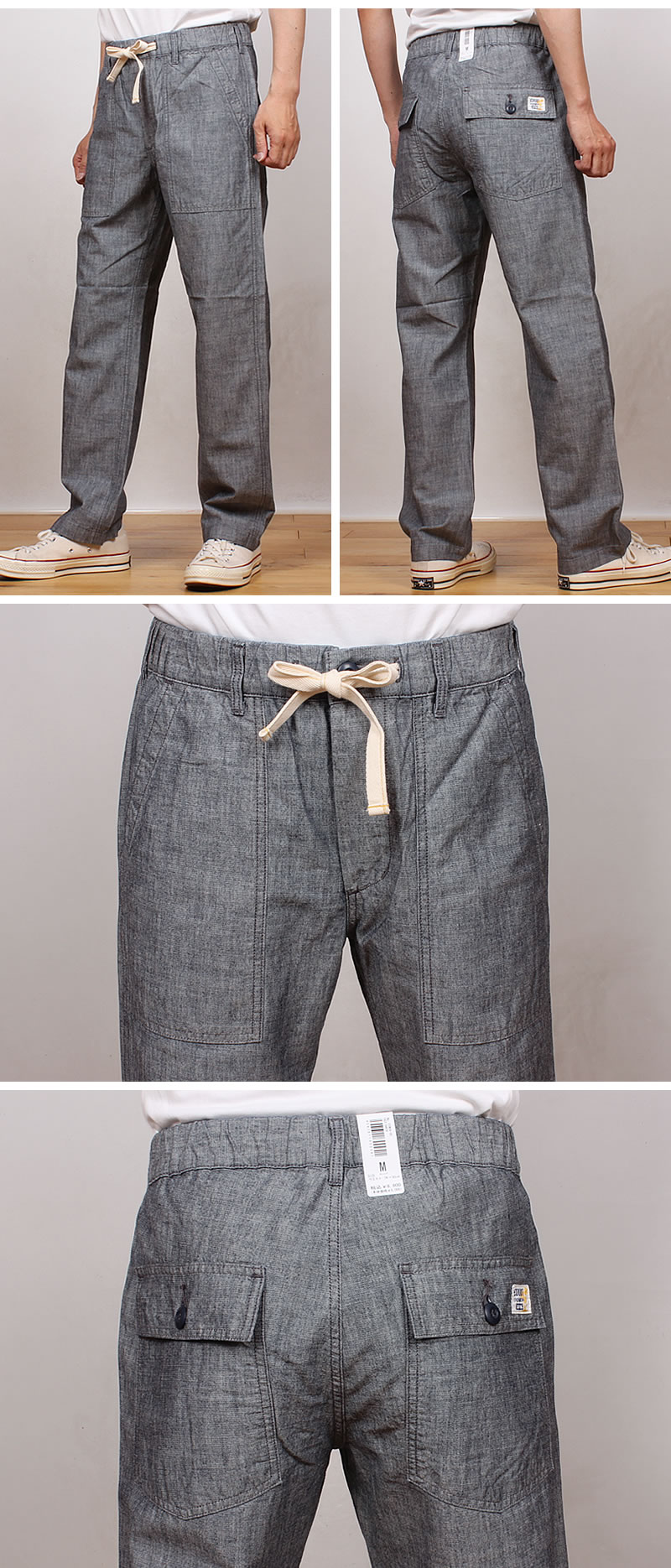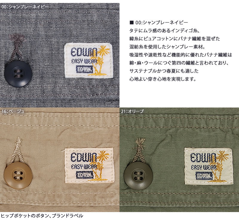 タテにムラ感のあるインディゴ糸、緯糸にピュアコットンにバナナ繊維を混ぜた混紡糸を使用したシャンブレー素材。吸湿性や速乾性など機能的に優れたバナナ繊維は綿・麻・ウールにつぐ第四の繊維と言われており、サステナブルかつ春夏にも適した心地よい穿き心地を実現します。