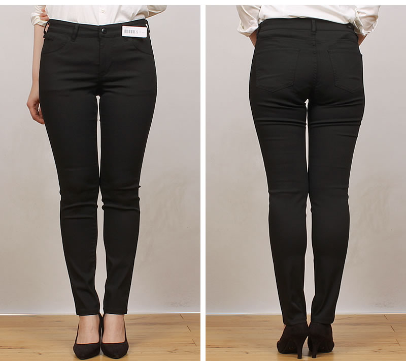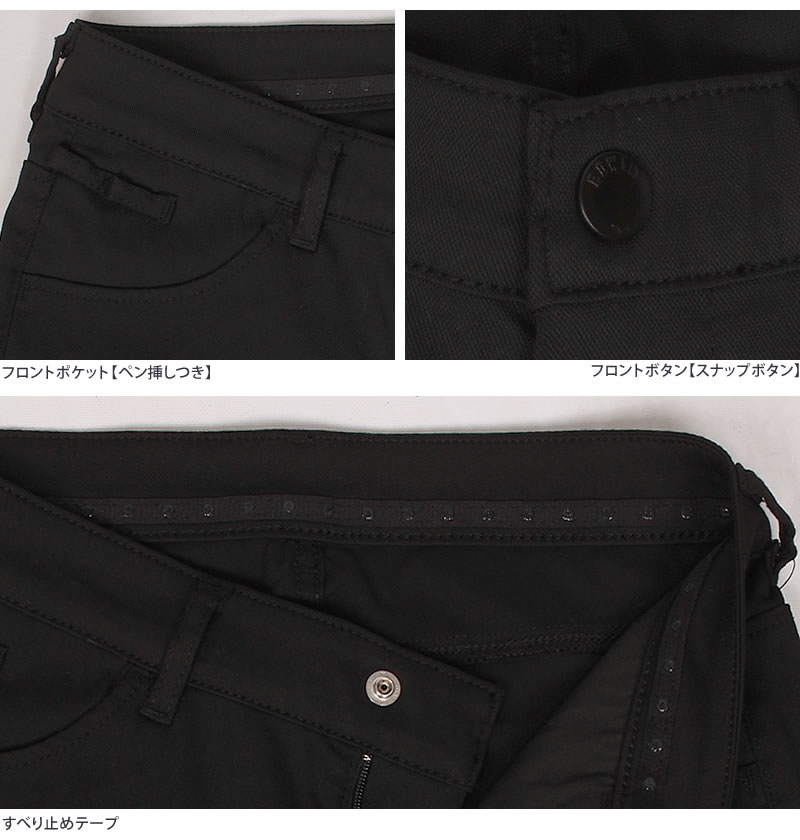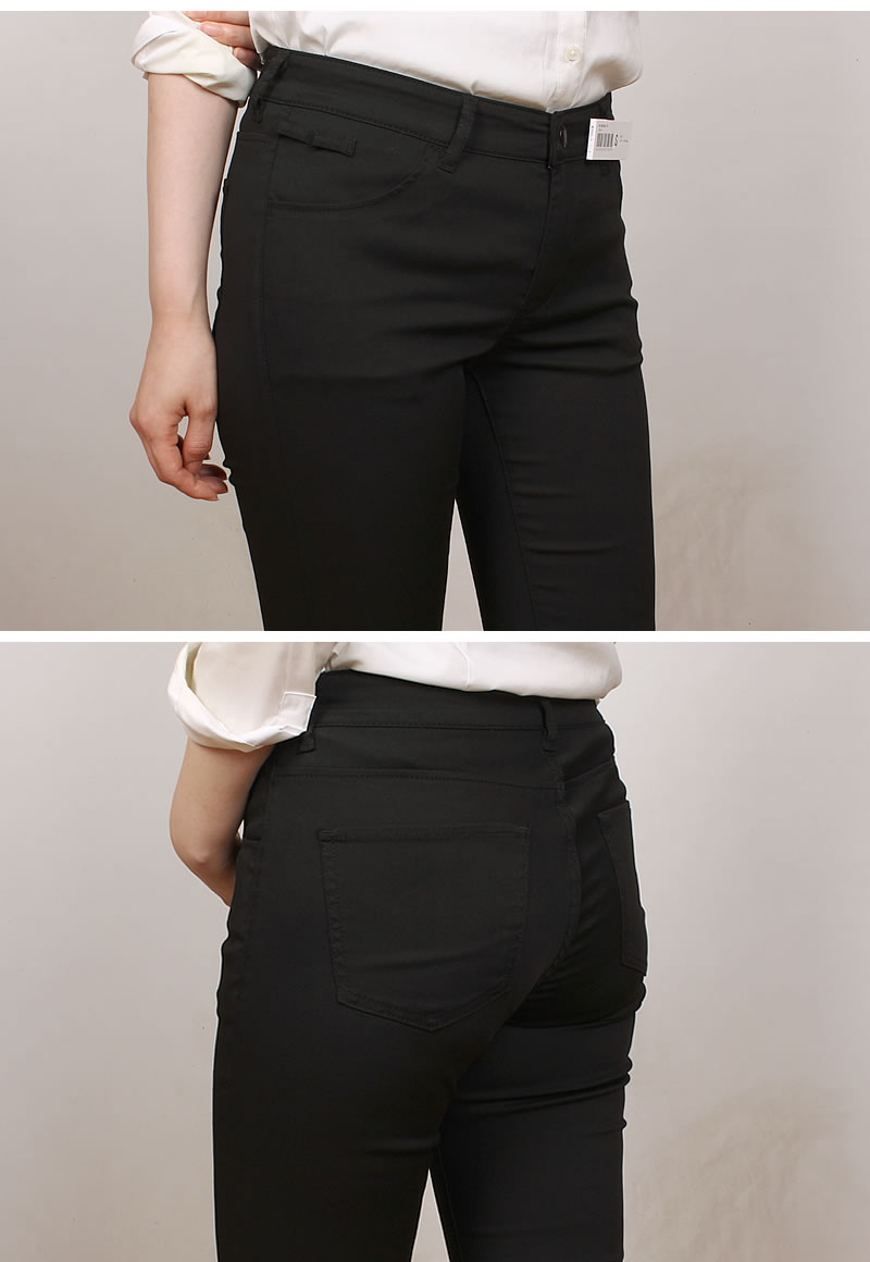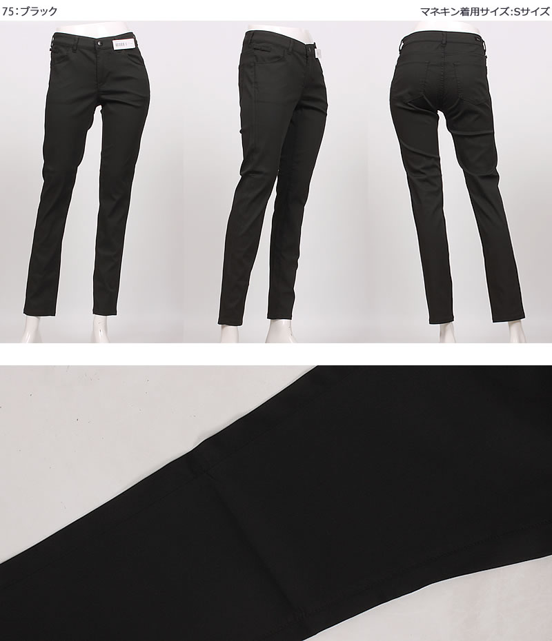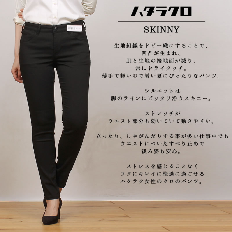 生地組織をドビー織にすることで、凹凸が生まれ、肌と生地の接地面が減り、常にドライタッチ。薄手で軽いので暑い夏にぴったりなパンツ。 ピッタリフィットのスキニーシルエット。身体のラインを綺麗に見せてくれます。ストレッチがウエスト部分も効いていて動きやすい。立ったり、しゃがんだりする事が多い仕事中でもウエストについたすべり止めで後ろ姿も安心。ストレスを感じることなくラクにキレイに快適に過ごせるハタラク女性のクロのパンツ。