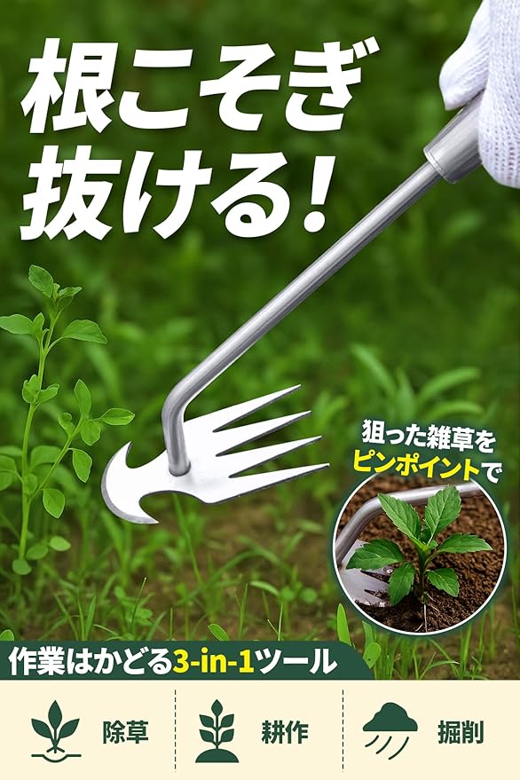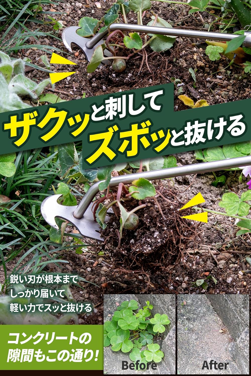 【深く刺さって根までしっかり抜ける】先端が細く鋭いため地面に差し込みやすく、雑草の根元までしっかり届きます。土に刺して引き上げるだけで根から抜き取りやすい。草刈りやガーデニング、家庭菜園の雑草対策におすすめの雑草除去ツールです。