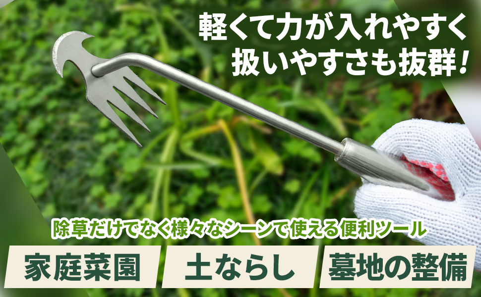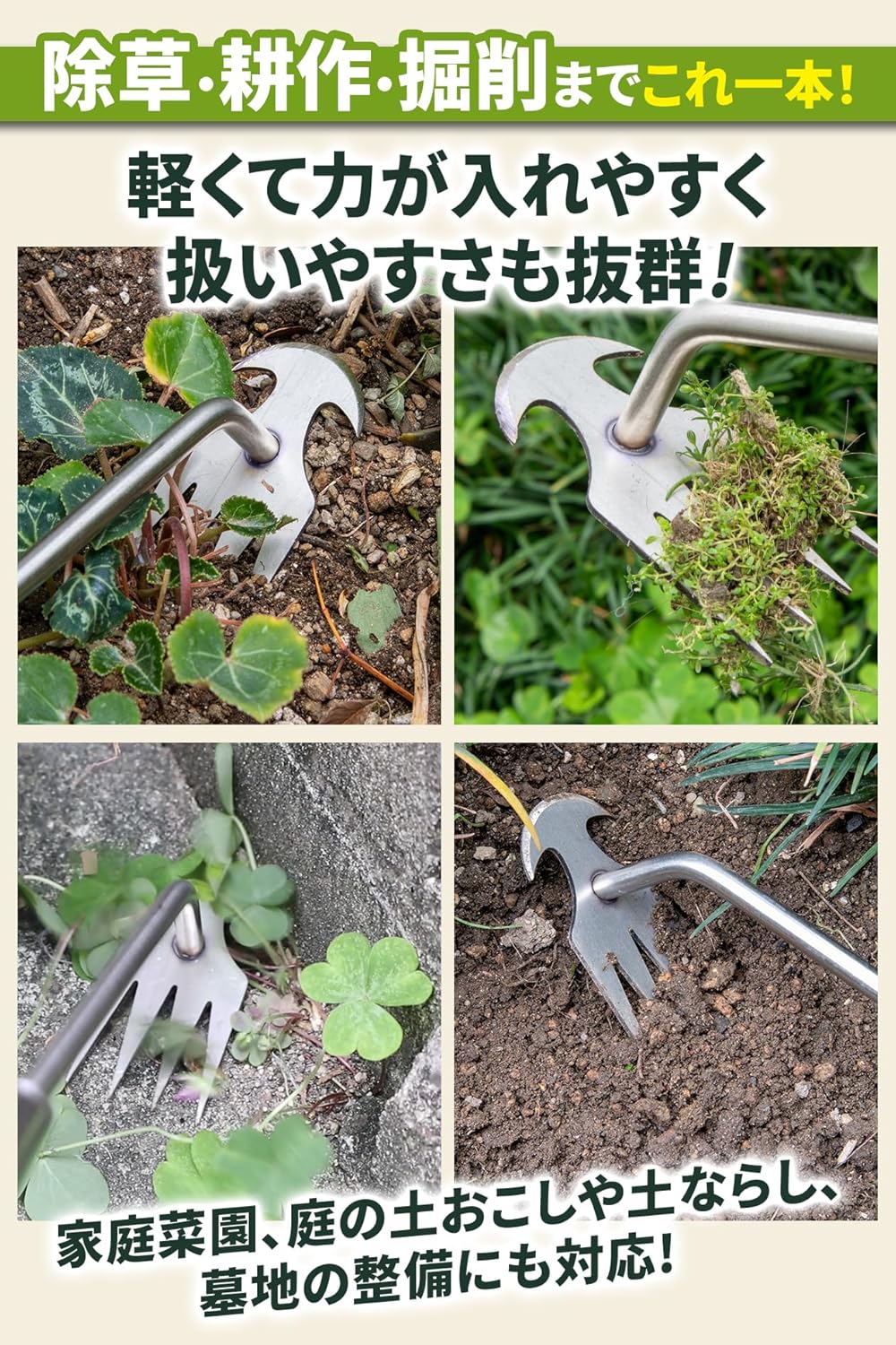 【多用途に使えるガーデンツール】この除草ツールは、雑草の除去だけでなく、土の掘り起こしや表面をならす作業にも活用できます。ガーデニング、家庭菜園、墓地の整備など、幅広い場面で役立つ1本。季節を問わず使える、実用的な園芸アイテムです。