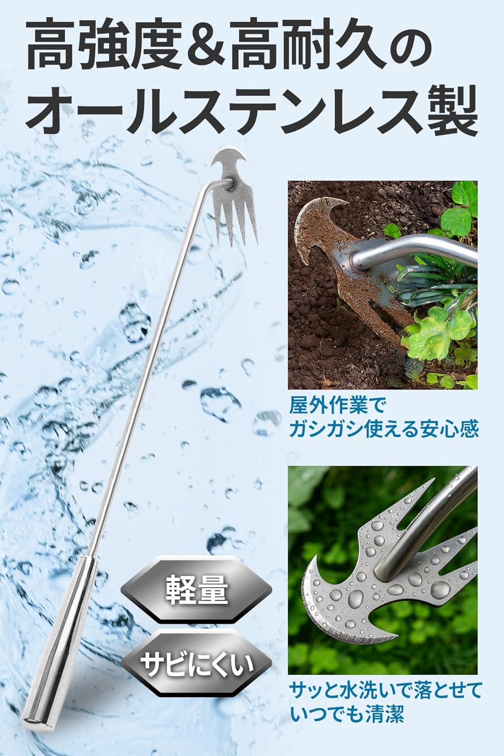 【サビにくく、お手入れも簡単】刃部からハンドルまで全てステンレス素材でできており、耐久性・耐食性に優れています。雨や湿気に強く、使用後も水でさっと洗うだけで清潔に保てます。長く使える草取り道具として、庭仕事にしっかり寄り添います。