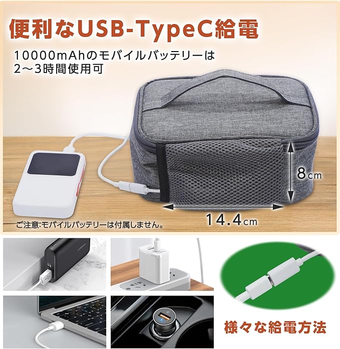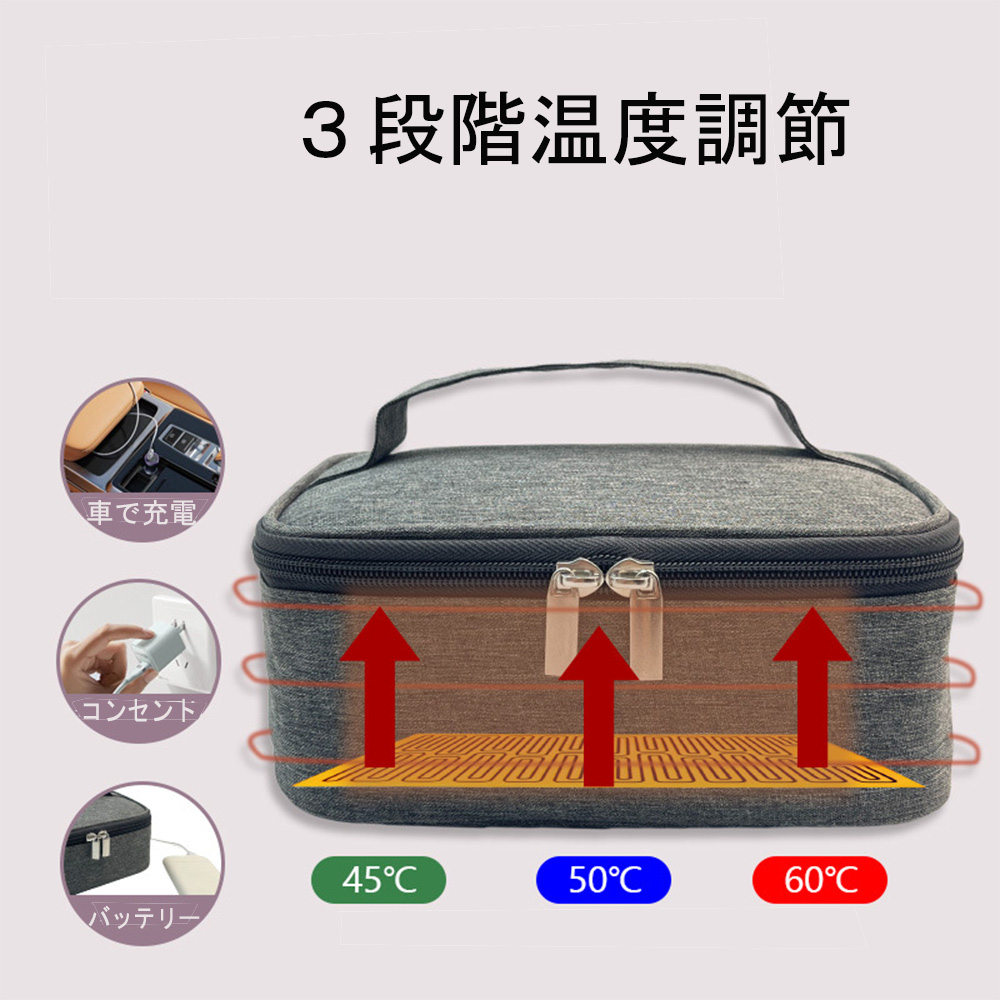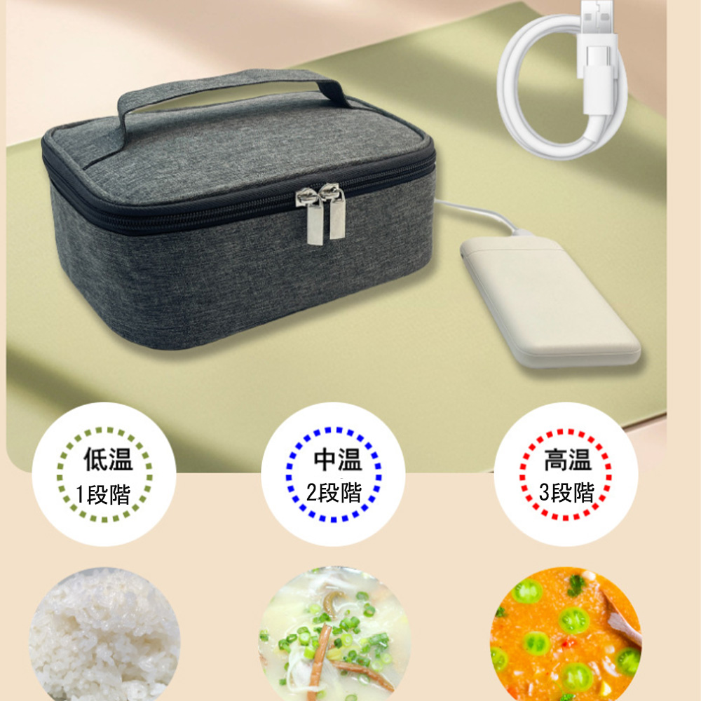 【USBヒーター内蔵】バッグ内にヒーターが内蔵されています。USB給電式なので、面倒な手間はかからず、モバイルバッテリーや車載電源のUSBポートに接続して使用できます。いつでもどこでも暖かくて美味しい物を食べます。(注意:5V2Aの電源を使用してください。ヒーターが発熱しないや温度が低い場合は、電源出力をチェックしてください。)