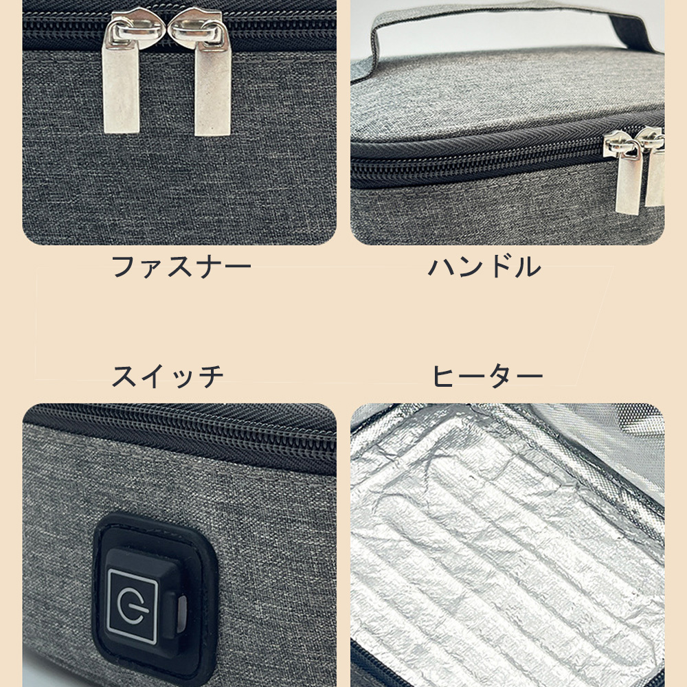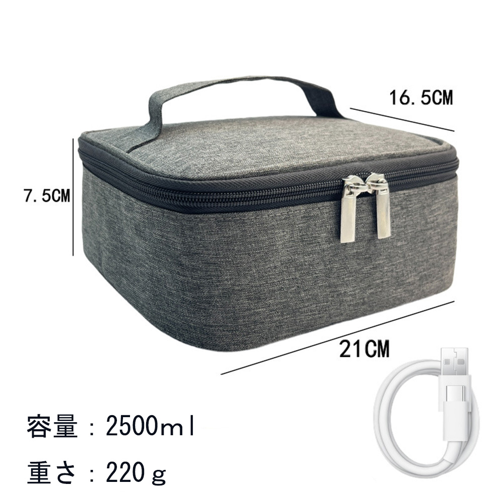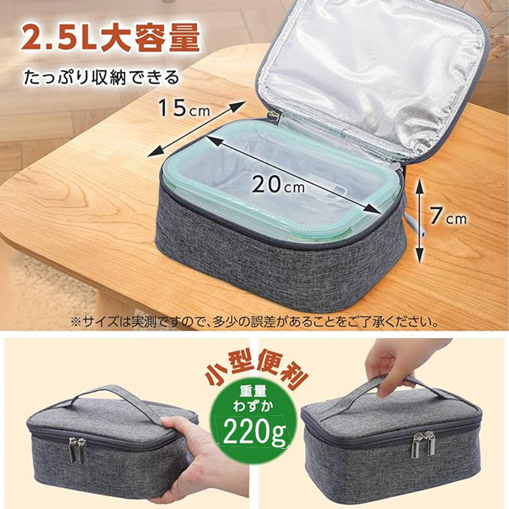 【2.5L 大容量】軽量でコンパクト、外側にメッシュポケットがあり、モバイルバッテリーを収納できます。電熱保温バッグはお弁当だけではなく、缶コーヒーなどの飲み物を入れることもできます。